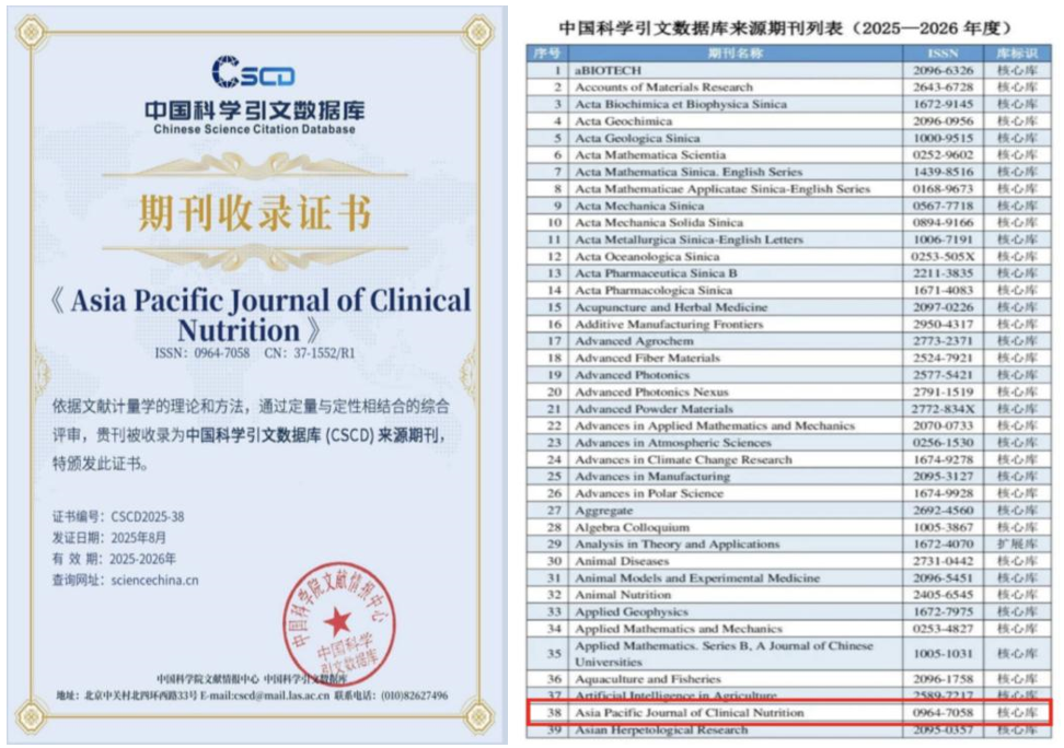 《亚太临床营养学杂志(英文)》成功入选 中国科学引文数据库(CSCD)核心库